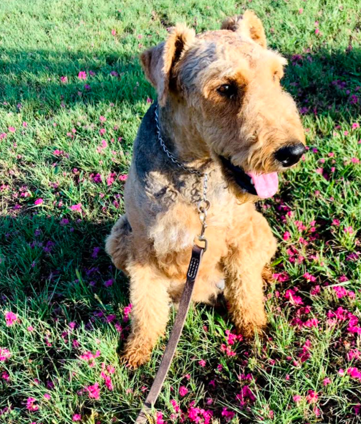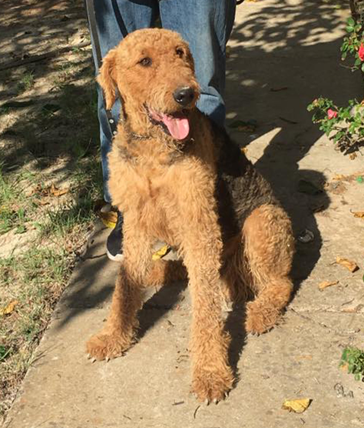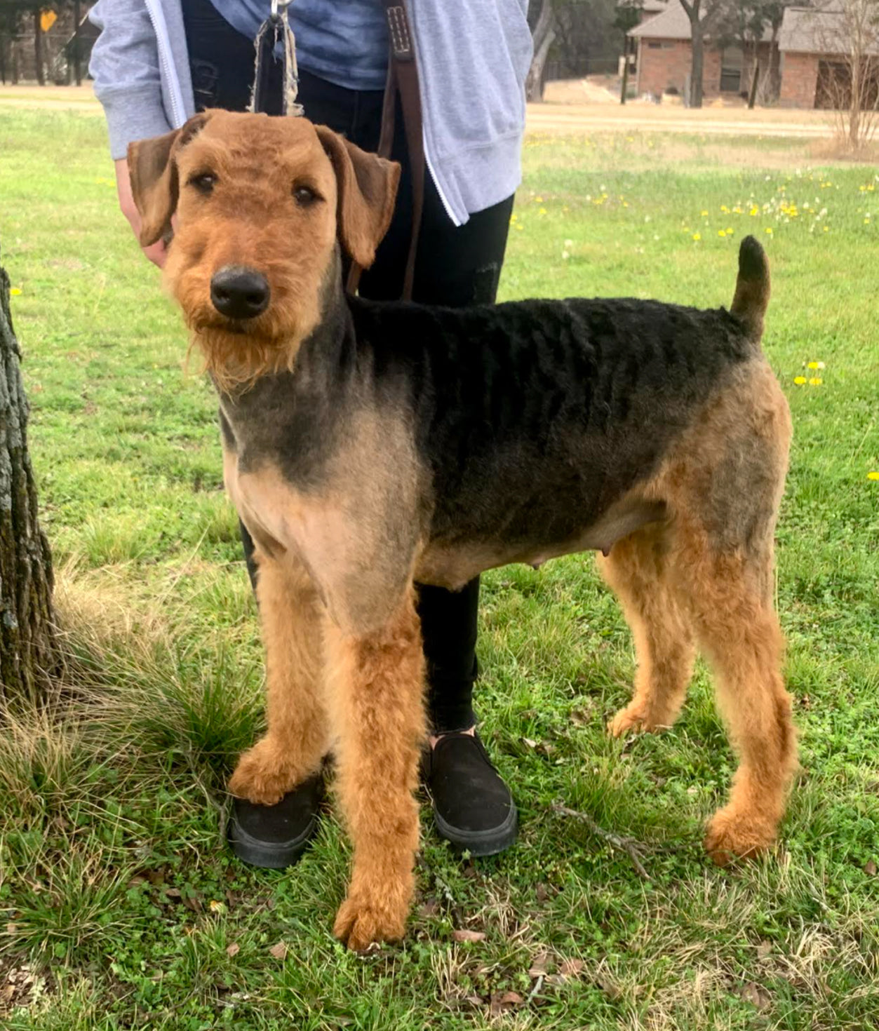 Ideal Dale Kosmo hales from the renowned Ideal Dale Kennel in Serbia and was bred by Goran Karanovic & Biljana Bjekic. Kosmo was born 4/12/2017 and was sired by Grand Champion Joval It’s My Time and his dam Is Ideal Dale Feel Good (Fila). Kosmo has several litter mates who have gone on to become champions and Kosmo has recently begun his show experience and has great bloodlines with Joval, Ideal Dale, Tymberwyck and Stirling. Kosmo came to Pilot’s Acres from Darren’s Airedales in Alabama last fall and has been training for the show ring and getting his coat in tip top condition.Kosmo has a great personality and loves his people and romps with Keeper (Piper) and Abbey. Weighing in at just 51 pounds, Kosmo is a fine example of the breed with a gorgeous coat, great expressive eyes, perfect ear and tail sets along with a body in perfect tone; he loves to strut his stuff both in and out of the ring.
